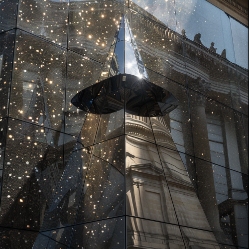 Enter a realm of enchantment and reflection: the majestic façade of the British Museum, gleaming with mirrored surfaces and metallic accents. At its pinnacle, a towering wizard's hat casts a spellbinding glow, hinting at the ancient magic housed within. This scene invites visitors to explore the intersection of mysticism and history, where the past and present converge in a shimmering display of wonder."