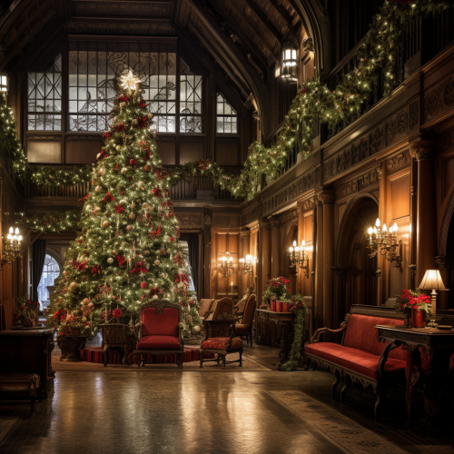 giant hall with christmas decorations and a giant pine tree fully decked out for the holidays