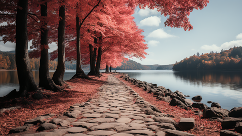 high fantasy style. A Medieval knight and his lady having a picnic beside a lake on a sunny, beautiful fall day. They are sitting facing the camera and he is not wearing a helmet so their faces can be seen.