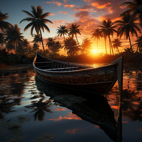coconut grooves near the lake, HD, natural colors, enchanting, a boat in the lake tied to a tree, (sunrise background), Photo realistic, masterpiece, 4k, High resolution, intricate detail, HDR, fantasy art, beautiful, radiant, colorful, serene, hyperdetailed, iridescent, vapor, ethereal, vibrant --s 750
