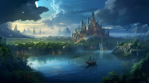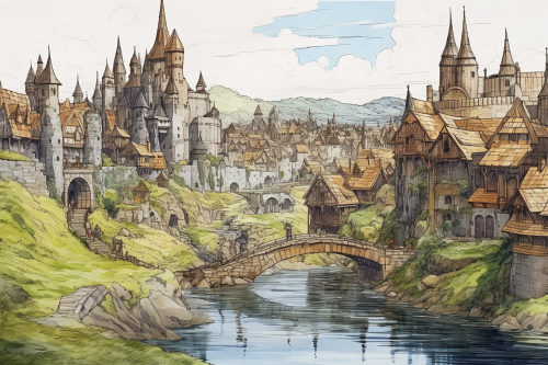 Fantasy town with Wooden palisade and round stone towers on the edge of a river, lord of the rings, flat grassland background, cinematic, felt-tip pen --ar 6:4