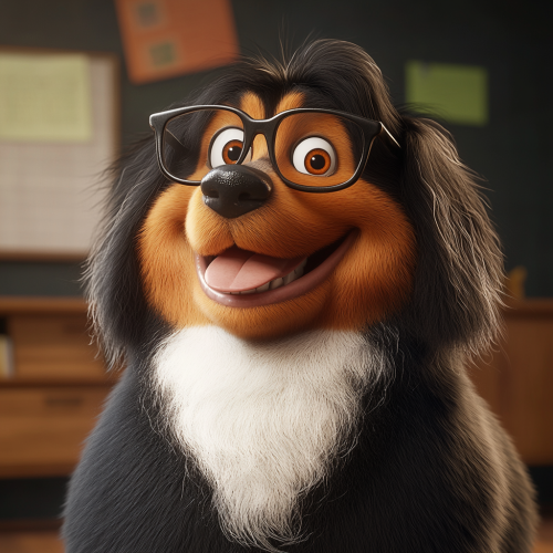 Bernese Mountain Dog, professor, black mens eyeglasses, portrait, long white beard, puppy eyes, classroom background, 3d character from Disney Pixar, black box, cinematic edge lighting --ar 1:1