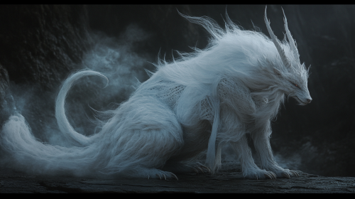 long shot photo, full body, The mythical beast , mysterious,Nine tails, horns on it's back, fantastic color, Beyond imagination --ar 16:9 --style raw --personalize q7ev1ef --v 6.1