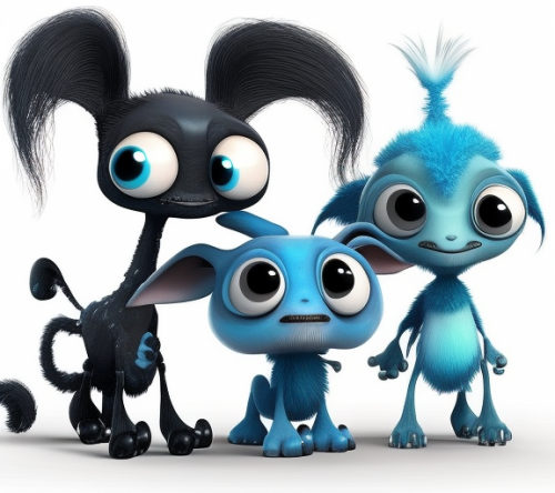 Three blue, dog-like creatures. One is standing on two legs and has long arms, while the other two have short hind limbs. They all look different but resemble dogs with black fur. The background is white. The style is cartoon, Pixar animation, and 2D game art, with a 45-degree angle and high resolution. --ar 31:27 --v 4