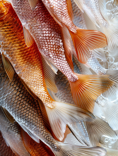 A photorealistic closeup of different types of fish tails, seafood, arranged in an aesthetically pleasing composition on a white background. The focus is on the delicate and intricate details of each tail, showcasing their unique shapes and colors. Soft lighting highlights the textures and colors of the scales, creating a visually appealing scene that captures the beauty and diversity of these underwater sea creatures. --ar 3:4