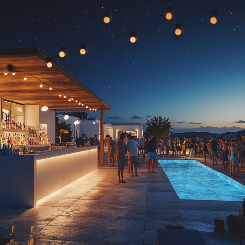 Photorealistic hd resolution image of an end of summer party in a terrace of a resort in Mikonos. There is a counter bar near a swimming pool. It is night and there are many people dancing and drinking