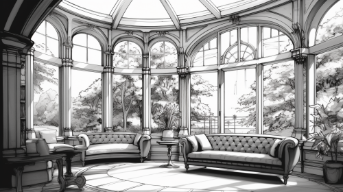 black and white draw of a bay window of a luxurious house with a view of a large garden during a large luxurious party inside --ar 16:9
