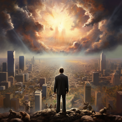 jesus fighting in the end of the world, flying in the city, hyper realistic image, 8k image, canon r5, super sharp details, realistic photo --ar 7:4 --v 5.1 --s 750