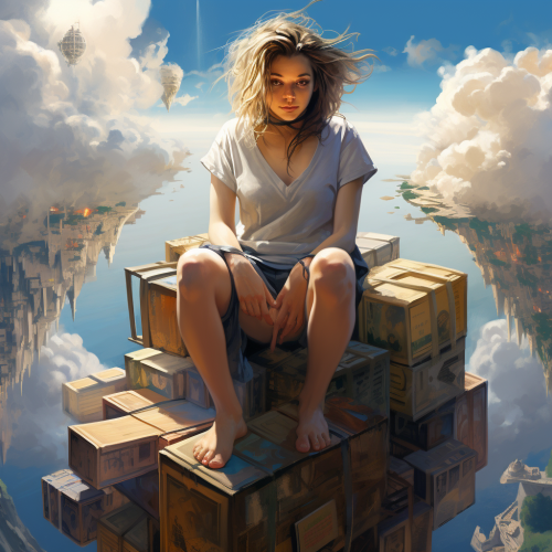 a female charecter with lush hair sitting on a cube at the end of the world, detailed