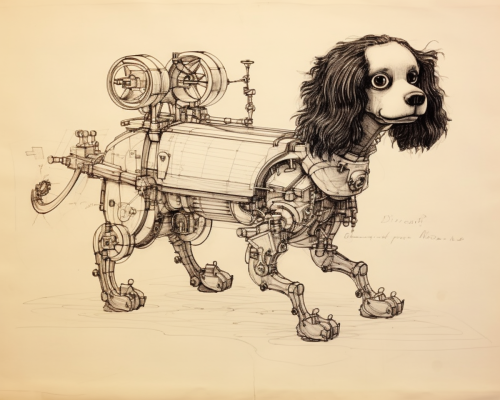 ink sketch of a futuristic mechanical King Charles Spaniel by leonardo da vinci --ar 5:4 --no crown