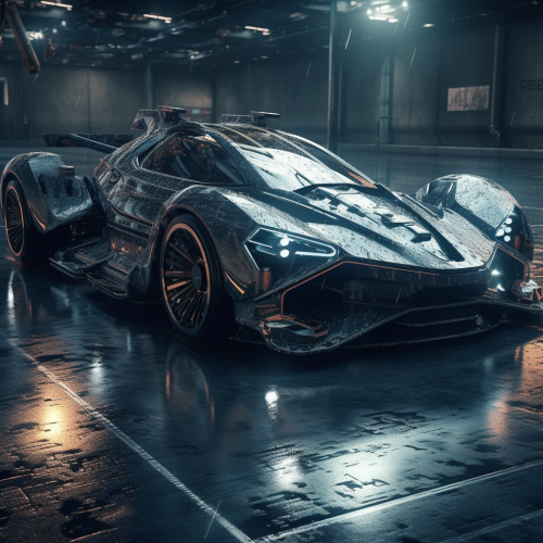 futuristic super race car, very high detail,soft flowing curved shapes, metallic gray, wet race track, keyshot,nighttime--ar 16:9 --s 1000 --v 5.0