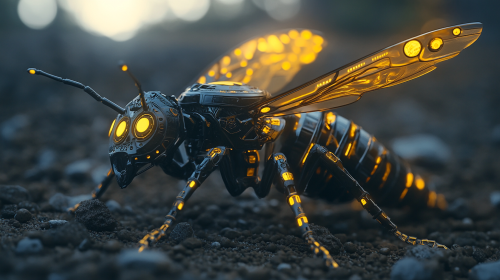 Macrophotography image of a mechanical Wasp on soil, highly detailed, 3D, smooth metal and LED illuminated mechanical gears, futuristic, hyper realistic, 8k, UHD, in the style of Frans Lanting, award winning national geographic, taken with a Canon EOS C300 Mark Ill with Canon CN-E 24mm T1.5 L F lens --ar 16:9