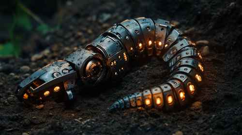 Macrophotography image of a mechanical Worm on soil, highly detailed, 3D, smooth metal and LED illuminated mechanical gears, futuristic, hyper realistic, 8k, UHD, in the style of Frans Lanting, award winning national geographic, taken with a Canon EOS C300 Mark Ill with Canon CN-E 24mm T1.5 L F lens --ar 16:9