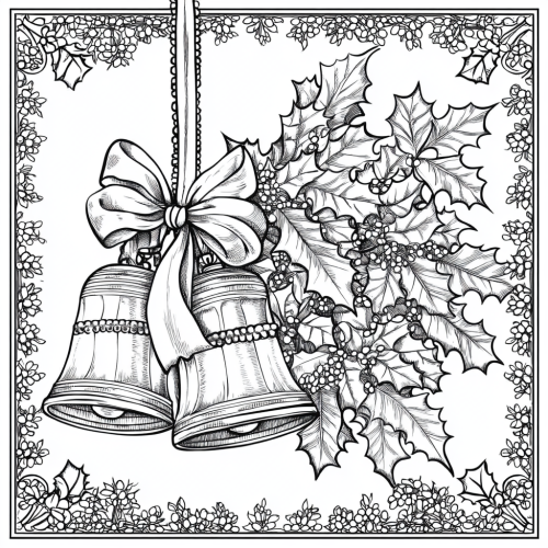 A simple coloring book of bells with a handle and a ribbon. next to the bells are 4 bunches of holly leaves. Clear and thin outlines, no shading, uncomplicated shapes, suitable for beginners, easy to fill areas, black and white line art, Christmas theme.