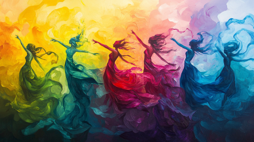 A group of dancers using colorful ribbons. The movement and intertwining of the ribbons symbolize the vibrations of strings and the creation of different particles in the universe. In the style of a trippy oil painting --ar 16:9 --s 250