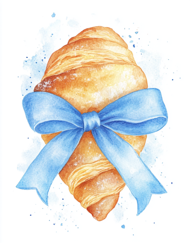Watercolor, a simple drawing on a white background, a croissant with a blue ribbon bow around it, pastel colors, cute and dreamy, a clipart design for a children's book illustration, in a flat art style, high resolution, soft edges, isolated in the middle, with a white transparent background, and with ice coffee --ar 25:32 --v 6.1