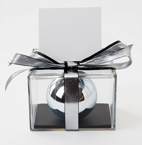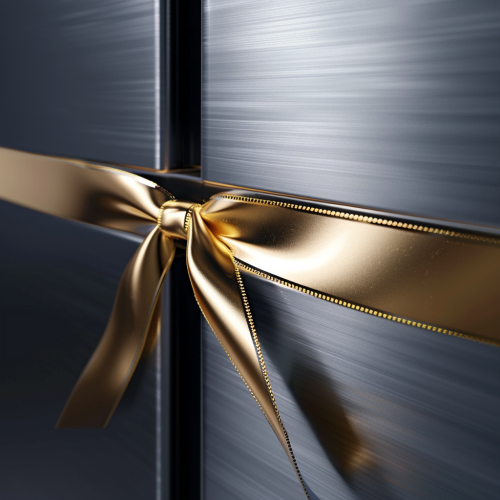 a photorealistic image of a close up of a brushed stainless steel fridge door with a gold ribbon across it