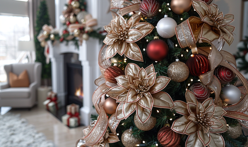 A close-up photo captures the intricate spiral wrapping technique of ribbon around the Christmas tree, creating an elegant and festive scene. --ar 5:3 --s 750 --v 6.0