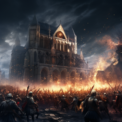 maximum photorealistic image of from a distance, a view of a massive battle in front of a French Cathedral between Knights in shinning armor vs byzantine legions