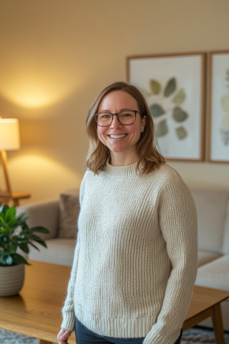 A woman in his mid-25s stands beside the dinning chairs, smiling at camera, wearing glasses and sweater, Scandinavian living room with beige walls, wooden coffee table, plants on top of it, framed artwork hanging above couch, soft lighting from ceiling lamp, serene atmosphere, professional photography style. --ar 2:3