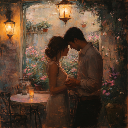 A soft and romantic scene that captures the essence of tenderness and gradual connection. The setting could be a serene and intimate environment, such as a softly lit room with cozy, warm colors, a tranquil garden at twilight, or a quiet, picturesque café. The central focus is on a gentle interaction between two figures, such as a slow, affectionate dance, a tender embrace, or a soft, loving gaze. The background features soothing, pastel colors like soft pinks, gentle blues, and warm creams to enhance the feeling of calm and intimacy. Subtle details like delicate light effects, gentle textures, or softly glowing elements add to the atmosphere of slow, sweet connection. The overall mood is tender and romantic, capturing the essence of taking time to savor each moment with sweetness and care.