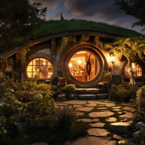 Step into the serene embrace of the coziest Hobbit home, nestled within the comforting aura of a dark night illuminated by the soft, silvery glow of a full moon. The enchanting moonlight spills through the circular window, casting ethereal patterns on the rustic interior, creating an otherworldly atmosphere that envelops the space in a gentle, celestial radiance. The focal point of the Hobbit home is the grand fireplace, meticulously constructed of sturdy stones, emanating a robust warmth that permeates every nook and cranny. The crackling flames within the fireplace create an enchanting dance of light and shadow, casting intricate patterns on the walls, infusing the space with a mesmerizing play of warmth and comfort. Amidst this captivating setting, a plush and inviting bed beckons, adorned with layers of soft blankets and cushions, providing a sanctuary of solace and tranquility. The gentle flicker of the fire paints the bed in a warm, golden hue, inviting you to surrender to the soothing embrace of the night within the cozy confines of the Hobbit home. Allow the soothing symphony of the crackling fire and the mystical allure of the full moon to envelop you in a serene sanctuary, as the celestial glow of the night intertwines with the comforting warmth of the stone fireplace. Embrace the enchanting ambiance of the Hobbit lifestyle, as the gentle harmony of light and shadow weaves an enchanting tale of comfort and peace within the heart of the mystical forest.