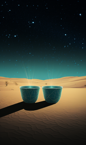 Two cups placed side by side in a desert setting with a connection of flowing energy between them. The cups are in Serene Oasis Teal, and the energy connection should be subtle, represented with a minimalist line or curve. Background in Deep Night Sky Blue, sprinkled with simple triangle patterns for added aesthetic appeal. --ar 3:5