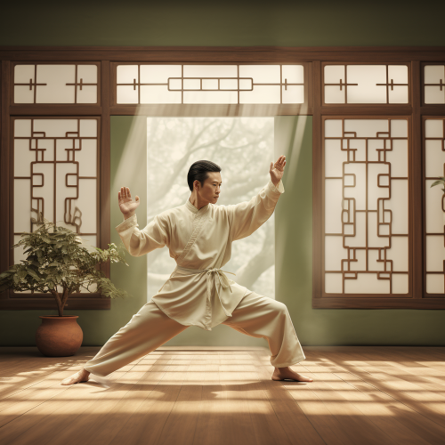 Chinese old man training in tai chi class room background in Antique beige or creamy silk-white, a warmer jade dark green and zisha-clay brown, 3d look feel add some Chinese touches, 16:9