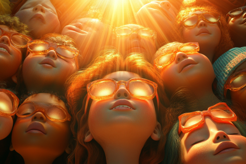 3d CGI animated image of children from around the world blinking in wonder, as rays of light begin to awaken their slumbering hearts and minds, very detailed, bright colors, childrens book image, cinematic lighting, --ar 3:2