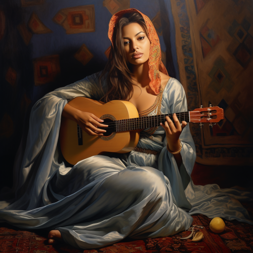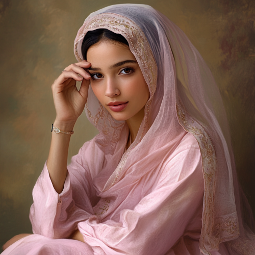 Create a digital portrait of a young Moroccan woman with a veil. She has warm, dark brown eyes and her veil is richly colored with traditional Moroccan geometric patterns. The background should be softly blurred, highlighting her as the focal point. Her expression is serene and confident, capturing a sense of grace and elegance. The lighting should be soft and natural, enhancing her features gently.
