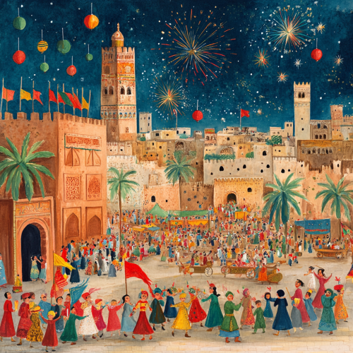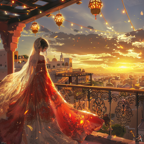 A detailed anime scene of a bride in a Moroccan wedding dress, rich red and gold fabrics with ornate patterns, standing on a balcony overlooking a serene Moroccan village. The scene is bathed in warm sunlight, with gentle breeze ruffling the dress and lanterns hanging above. Studio Ghibli-style animation, soft brushstrokes, atmospheric depth, luminous sky, dreamlike quality --v 6.0