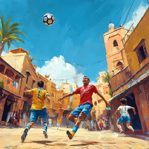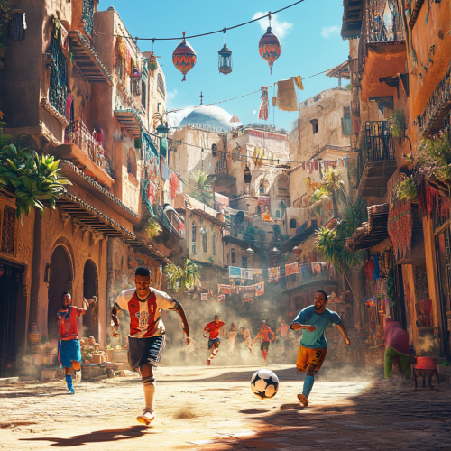 Create a powerful advertising poster for a Moroccan-inspired street football video game, similar to 'Kings League' and 'FIFA 25.' The poster should highlight the intense, raw energy of a street football match set in a Moroccan medina, featuring vibrant colors, traditional architecture, and players in action. Moroccan details, like mosaic patterns, colorful buildings, and spectators on rooftops, add authenticity to the scene. The focus is on the excitement and passion of street football, with a dynamic, gritty feel. The game's logo should be prominently displayed, capturing the essence of the game’s unique Moroccan twist.