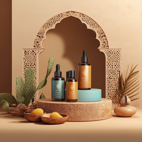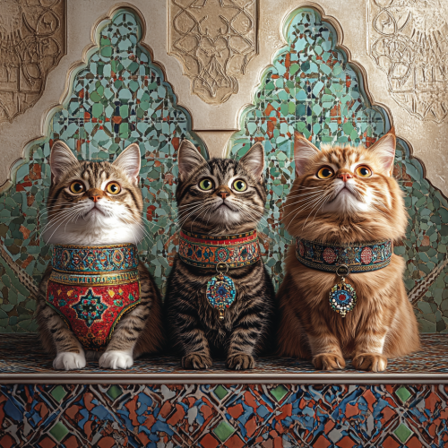 Create a 1080x1080 advertising poster featuring different styles of Moroccan cat collars displayed on a stylish table. The collars should showcase a variety of traditional Moroccan patterns and vibrant colors, such as reds, blues, and greens. The table should have an elegant surface, possibly adorned with Moroccan tiles or a textured fabric. Ensure the focus is on the collars, highlighting their unique designs and craftsmanship. Aim for a visually appealing layout that captures the essence of Moroccan culture and attracts cat lovers.