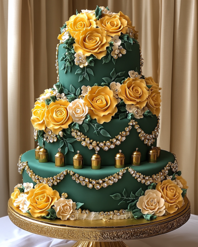 Create a multi tiered cake design using shades of Green and shiny gold. Persian Moroccan Turkish design inspired cake design. An arrangement of baby roses in bright yellow with ivy and small flowers are on the top. The bottom of this cake has the same type of flowers. Rhinestones and gems. Swag fondant draped edges. Brass tiny perfume bottles. This cake sits on a gold cake stand on a dessert table with ruffled tablecloths. There are curtains in the background and excellent lighting and spotlights on the cake. --ar 4:5 --v 6.1 --stylize 300