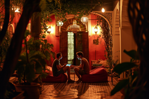 la nuit, deux hommes europeens qui discutent assis sur des coussins marocains rouges dans la cour d’une villa. il sont en short et torses nu. il y en a un qui a un pc portable sur les genoux. le carrelage est blanc et les murs en crépis. les 2 hommes rigolents. --ar 3:2 --v 6.0