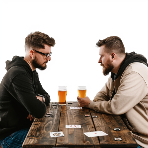 I need two men sitting face to face at a wooden table, one of them is actually reading a card from a card game, with cards on the table from the same card game and two glasses of beer scop, from a perspective of side and with a white background --v 6.0