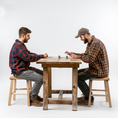 I need two men, dressed casually, sitting face to face at a long, normal four-legged wooden table and on this table there is a stack of cards from a game, one of them is reading the card, this image has to be looked at from one side. side perspective, i need this on a white background, hyper realistic --v 6.0