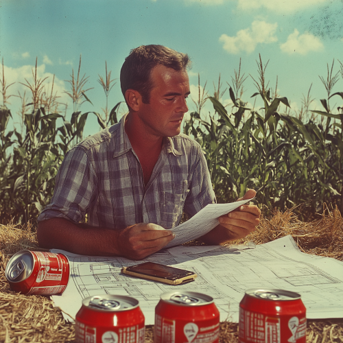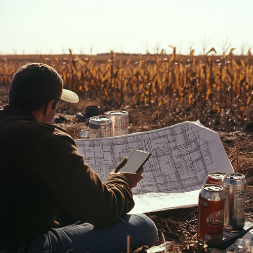 zoomed-in over the shoulder shot of a man reading large construction plans working outdoors on a residential building site in the 1970s in corn fields in North America. There is an iphone laying flat on top of the construction plans. There are 5 beer cans laying around. photography style consistent with the 1970s. --s 50