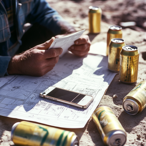 over the shoulder shot of a man reading construction plans working outdoors on a construction site in the 1970s in North America. There is an iphone laying flat on top of the construction plans. There are 5 beer cans laying around. photography style consistent with the 1970s. --s 50