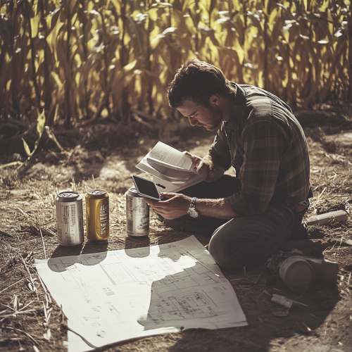 portrait shot of a man reading construction plans working outdoors on a residential construction site in the 1970s in a North American corn field. There is an iphone laying flat on top of the construction plans. There are cans of Fosters beer laying around. grainy vintage photography --s 50