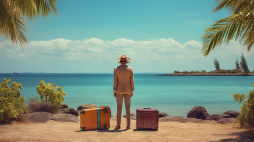 a man standing with his luggage near a beach resort, photograph, 4K, --ar 16:9