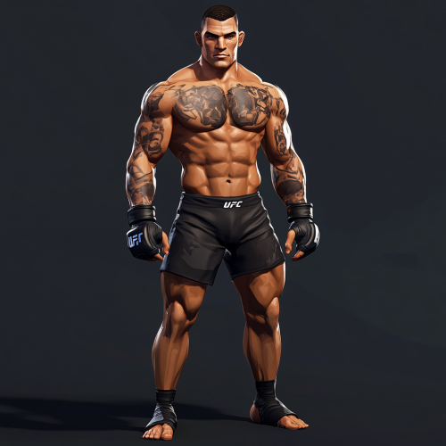 an ai generated image of a 3D animated mma fighter. It's a full body shot, with the fighter wearing black shorts, black 6 oz gloves, no shoes, and no knee pads. Have his physique be lean and caricaturized. The graphics are inspired by games like gta VC, super punch out, tf2. Be more stylized than realistic. --style raw