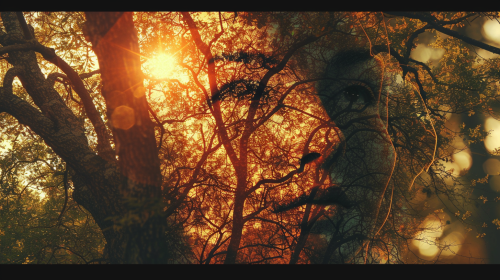 hidden image of what appears to be a woman's face within the trees, sunset mystical --ar 16:9 --s 50 --v 6.0