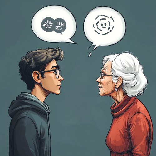 A very young man and an elder woman facing each other and talking using word balloons. The white word balloons each contain symbols inscrutable to the other conversationalist