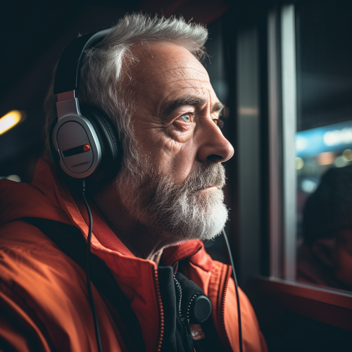 No generation gap, positive, communication, technology, head set, mobile phone, beeper, hyper-realistic, grain effect, 35mm, Fujifilm 400H pro,cinematic colour grading, grain effect