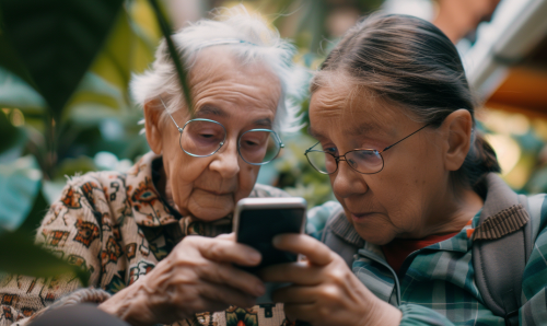 Capture a scene where a younger family member, perhaps a grandchild, is patiently teaching an 70s elderly person how to use a smartphone. --ar 5:3 --v 6.0 --style raw