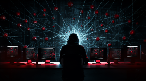 cyberattack, hacking, cybersecurity, dark purple, dark blue, pink, light blue --ar 16:9 --q 0.5 --s 250