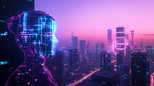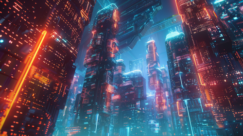 An abstract digital landscape with towering AI-driven structures in the background, their surfaces covered in glowing circuits and flowing data patterns. The sky is filled with holographic symbols representing AI algorithms. Lighting is sharp with deep shadows, emphasizing the integration of AI into the scene. Created Using: concept art techniques, cyberpunk influences, 3D modeling, vibrant colors, hd quality, vivid style --ar 16:9 --v 6.0