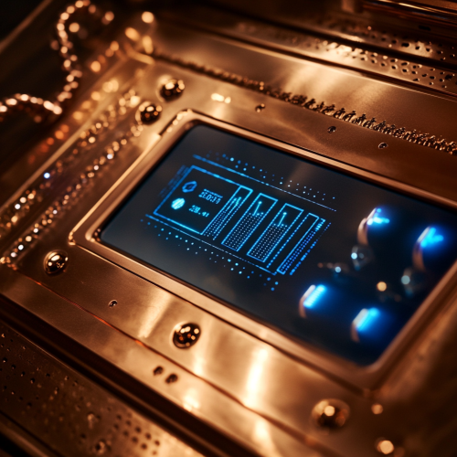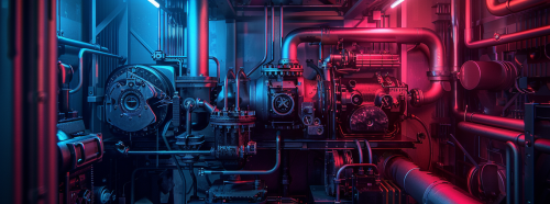 An ultra sophisticate modern steam machine working at full regime, wireframe, digital, red and blue, cinematic light, photo realistic, --ar 19:7 --v 6.0