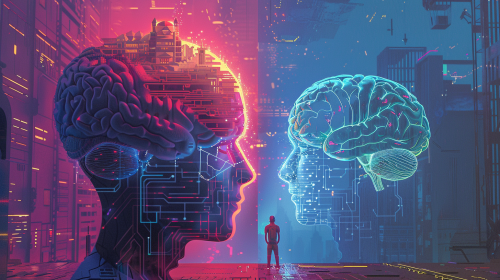 A highly detailed digital painting of a split human and AI brain working together, connected by glowing circuits, solving complex real estate challenges. The human brain is organic and full of color, while the AI half glows with futuristic circuitry. A real estate agent stands in the background, overseeing the process as holographic buildings form in the air. Created Using: fine brushstrokes, detailed textures, symbolic lighting, futuristic realism, holographic elements, hd quality --ar 16:9 --v 6.0